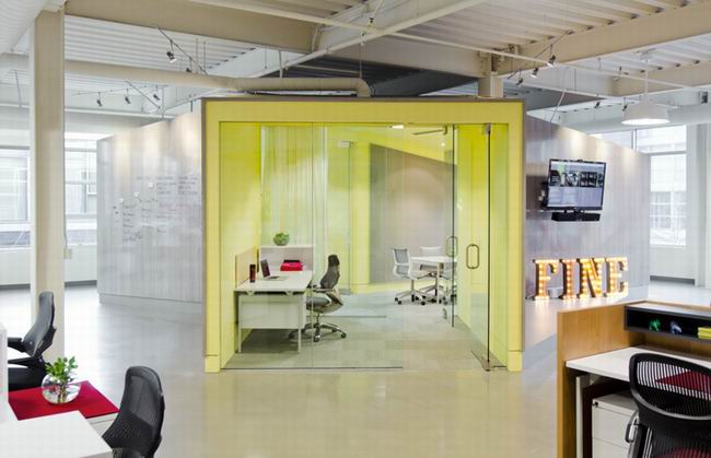 2013-5-8這是一個閣樓式的開放辦公環境,使用外露的鋼結構和平滑的混凝土地面,擁有豐富的自然光線。在入口處設立三個“黃盒子”,定會使外來人員感覺新鮮有趣,淡淡的鵝黃色調柔和又清新。辦公空間的分布整齊有序但頗具人情味,時尚的靚色軟裝功不可沒。...[繼續閱讀] -