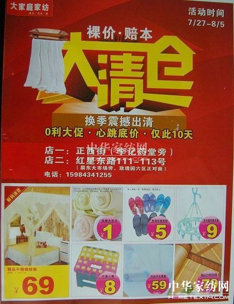 2012-7-25活動時間:7月27---8月5日精品不銹鋼蚊帳,69元,防滑拖鞋5元,精品玉竹席1.8*2米=79元;純棉毛巾1元。。。。。。詳情進店咨詢地址:店一:正西街(李記藥堂旁)店二:紅星路111——113號電話:15984341255...[繼續閱讀] -