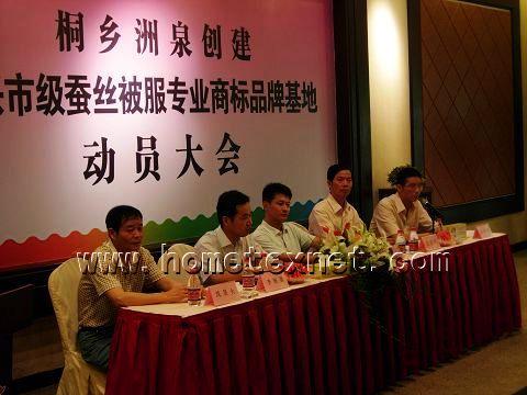 此次大會由桐鄉市洲泉鎮人民政府、桐鄉市工商局主辦,洲泉蠶絲被服行業協會和四季匯家紡商城協辦,洲泉鎮100余家從事蠶絲被服行業的企業主前來參加。會議主要是貫徹落實“創業創新”戰略和深化品牌建設的要(yao)求(qiu),開展(zhan)桐鄉(xiang)市(shi)蠶絲被(bei)(bei)服(fu)(fu)產業(ye)(ye)創(chuang)建(jian)“嘉興市(shi)級商(shang)標(biao)品(pin)(pin)牌(pai)(pai)基(ji)地(di)(di)”動(dong)員活(huo)動(dong)。明(ming)確(que)創(chuang)建(jian)品(pin)(pin)牌(pai)(pai)基(ji)地(di)(di)的具體目標(biao):確(que)保2009年成(cheng)功(gong)創(chuang)建(jian)嘉興市(shi)級蠶絲被(bei)(bei)服(fu)(fu)行業(ye)(ye)商(shang)標(biao)品(pin)(pin)牌(pai)(pai)基(ji)地(di)(di),使基(ji)地(di)(di)內60%的企業(ye)(ye)擁(yong)有注(zhu)冊商(shang)標(biao);品(pin)(pin)牌(pai)(pai)基(ji)地(di)(di)內蠶絲被(bei)(bei)服(fu)(fu)企業(ye)(ye)要(yao)培(pei)育省(sheng)(sheng)著(zhu)名(ming)商(shang)標(biao)1件(jian)以上(shang),嘉興市(shi)著(zhu)名(ming)商(shang)標(biao)5件(jian)以上(shang);要(yao)形成(cheng)區域經(jing)濟特色(se)明(ming)顯(xian),擴(kuo)大產業(ye)(ye)規模,行業(ye)(ye)產值位居全省(sheng)(sheng)同(tong)行前列,并(bing)在(zai)全國(guo)有較(jiao)大影響力(li)。在(zai)此基(ji)礎上(shang),進一步(bu)創(chuang)建(jian)省(sheng)(sheng)級專(zhuan)業(ye)(ye)商(shang)標(biao)品(pin)(pin)牌(pai)(pai)基(ji)地(di)(di)。會議在(zai)四季(ji)(ji)匯家(jia)紡商(shang)城召開,也將為(wei)洲泉蠶絲被(bei)(bei)企業(ye)(ye)利用四季(ji)(ji)匯這個五星級平臺,加(jia)強品(pin)(pin)牌(pai)(pai)建(jian)設,開啟(qi)了合作之門。
